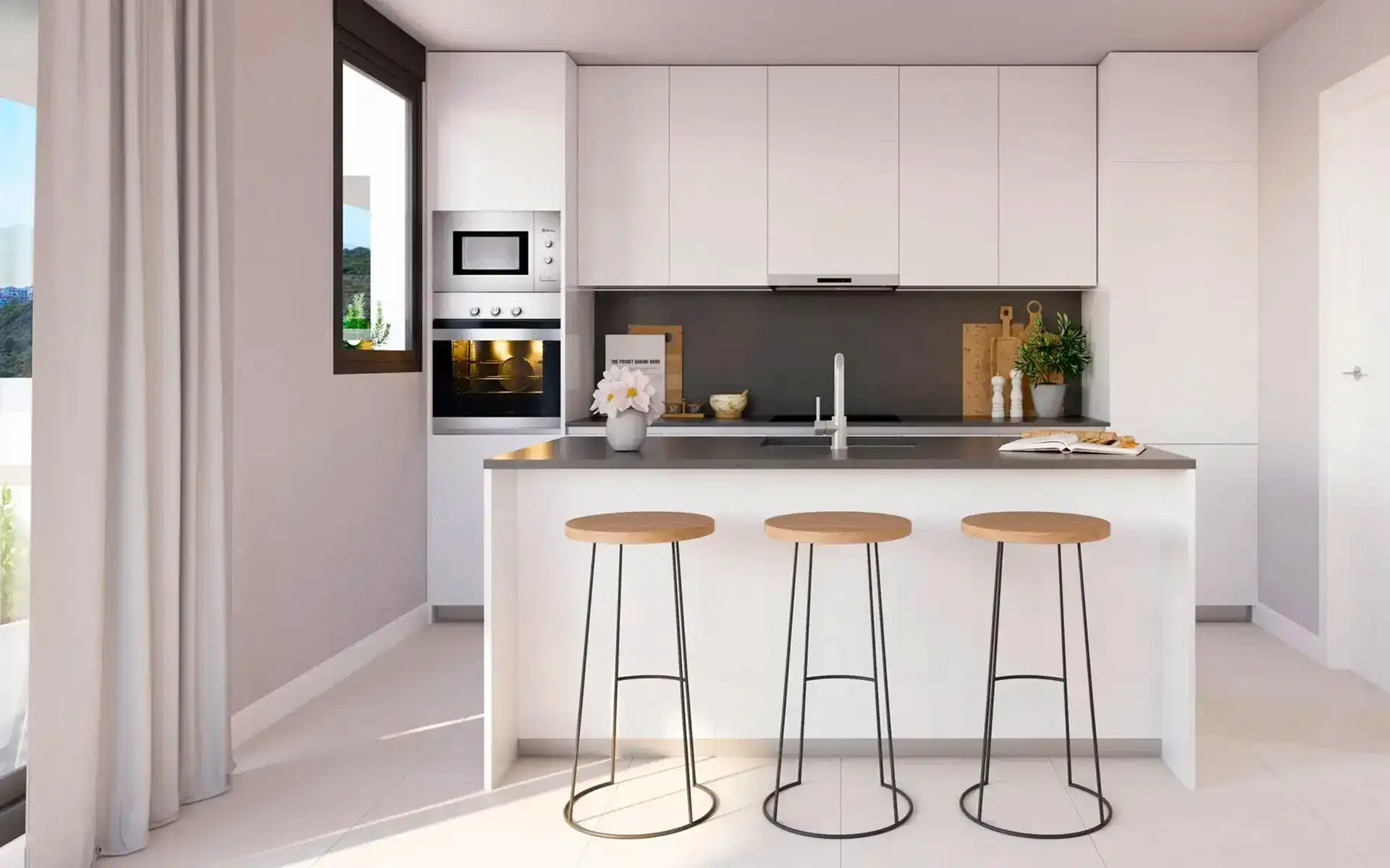 Salon i jadalnia prowadzą na przestronne tarasy, wpuszczając do środka mnóstwo naturalnego światła. Otwarte kuchnie są w pełni wyposażone w najnowocześniejsze urządzenia AGD o niskim zużyciu energii.