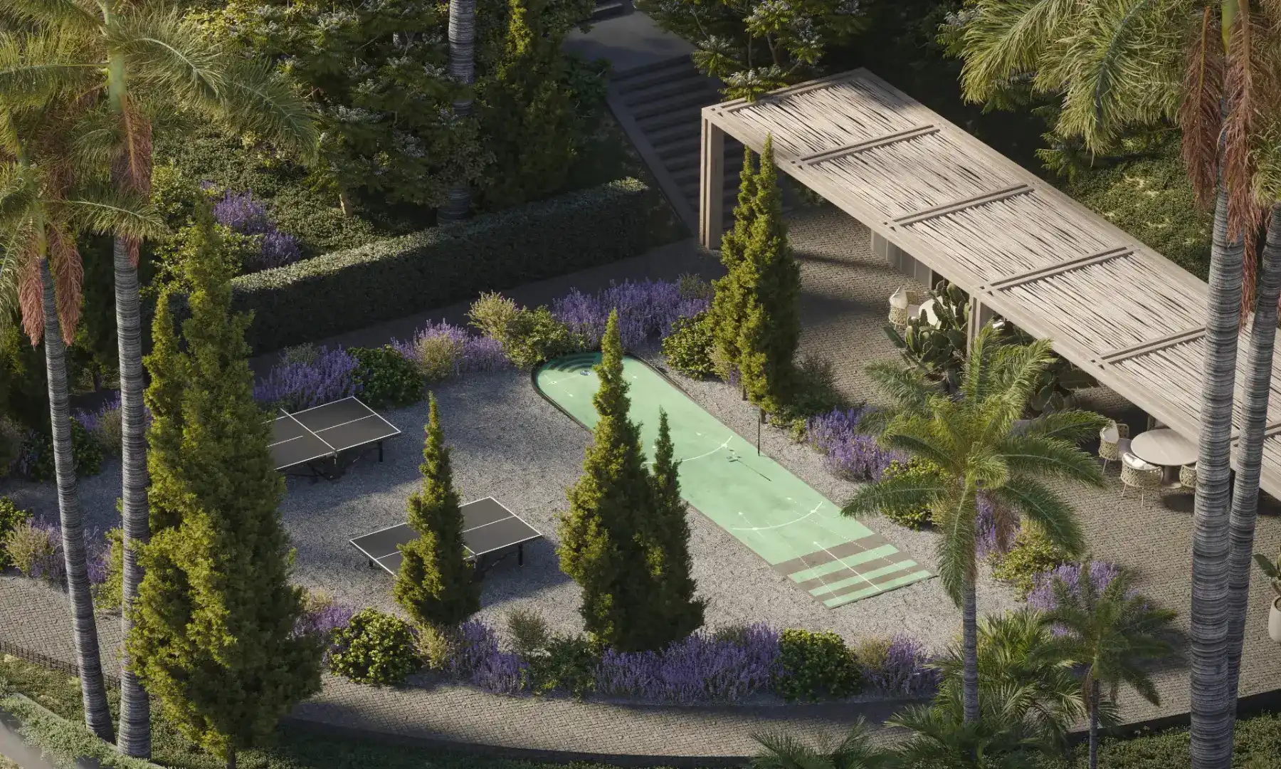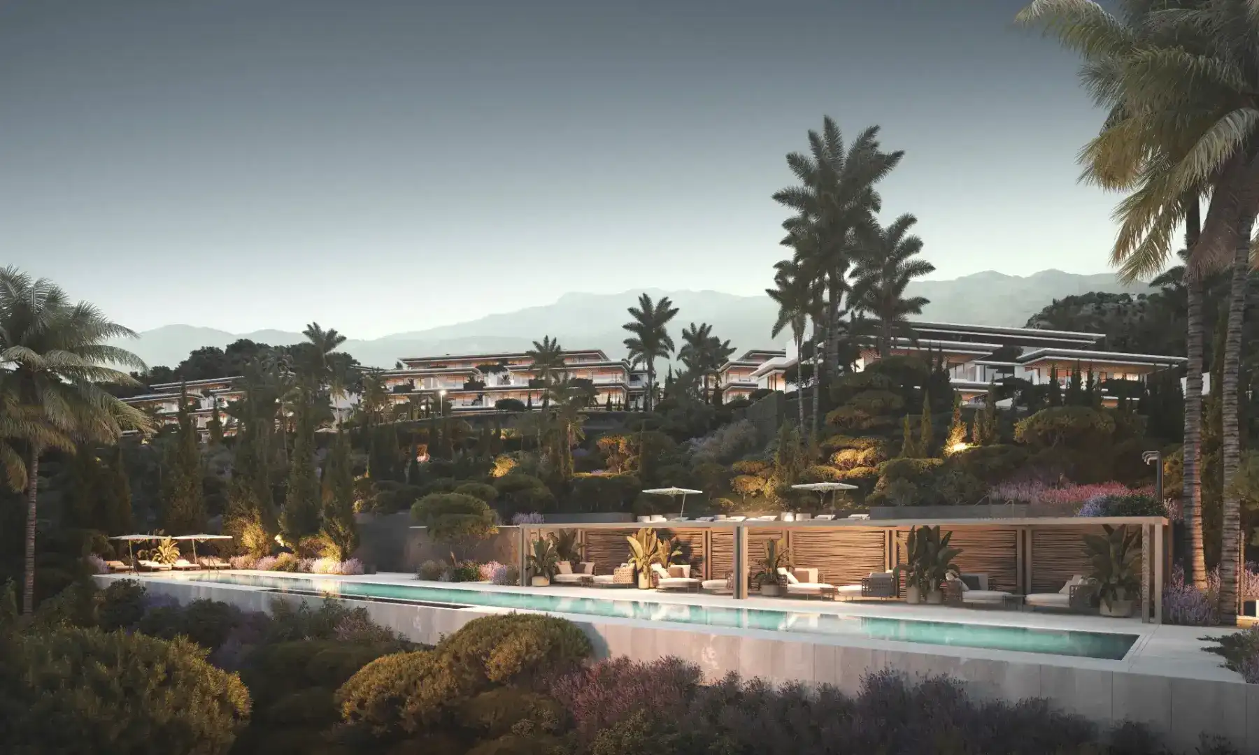 Bujne, starannie zaprojektowane ogrody, zacienione alejki oraz zielone strefy relaksu wyznaczają spokojny rytm codzienności, zachęcając do odpoczynku i kontaktu z naturą. Z dbałością dobrana roślinność śródziemnomorska harmonijnie współgra z elegancką architekturą krajobrazu.