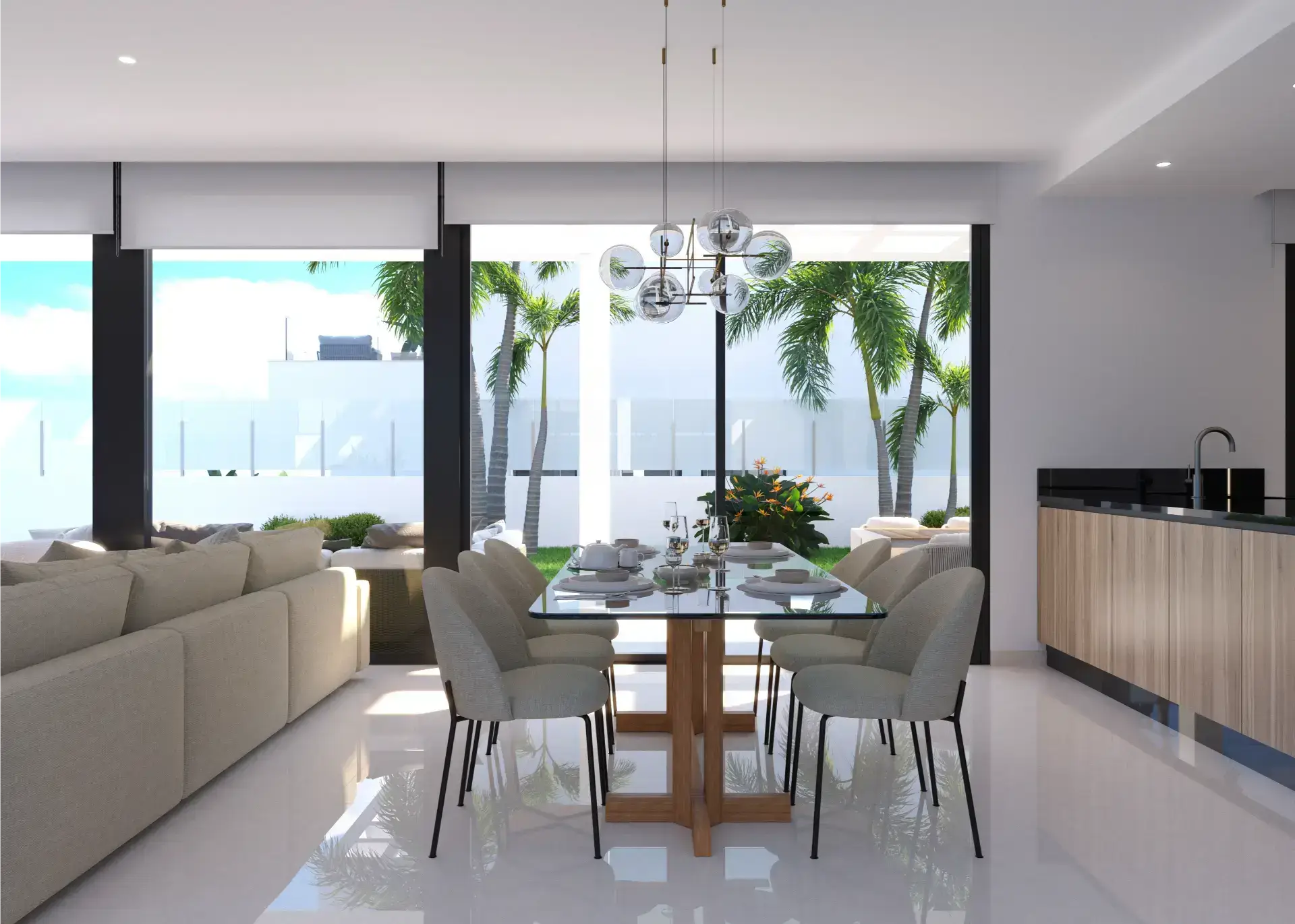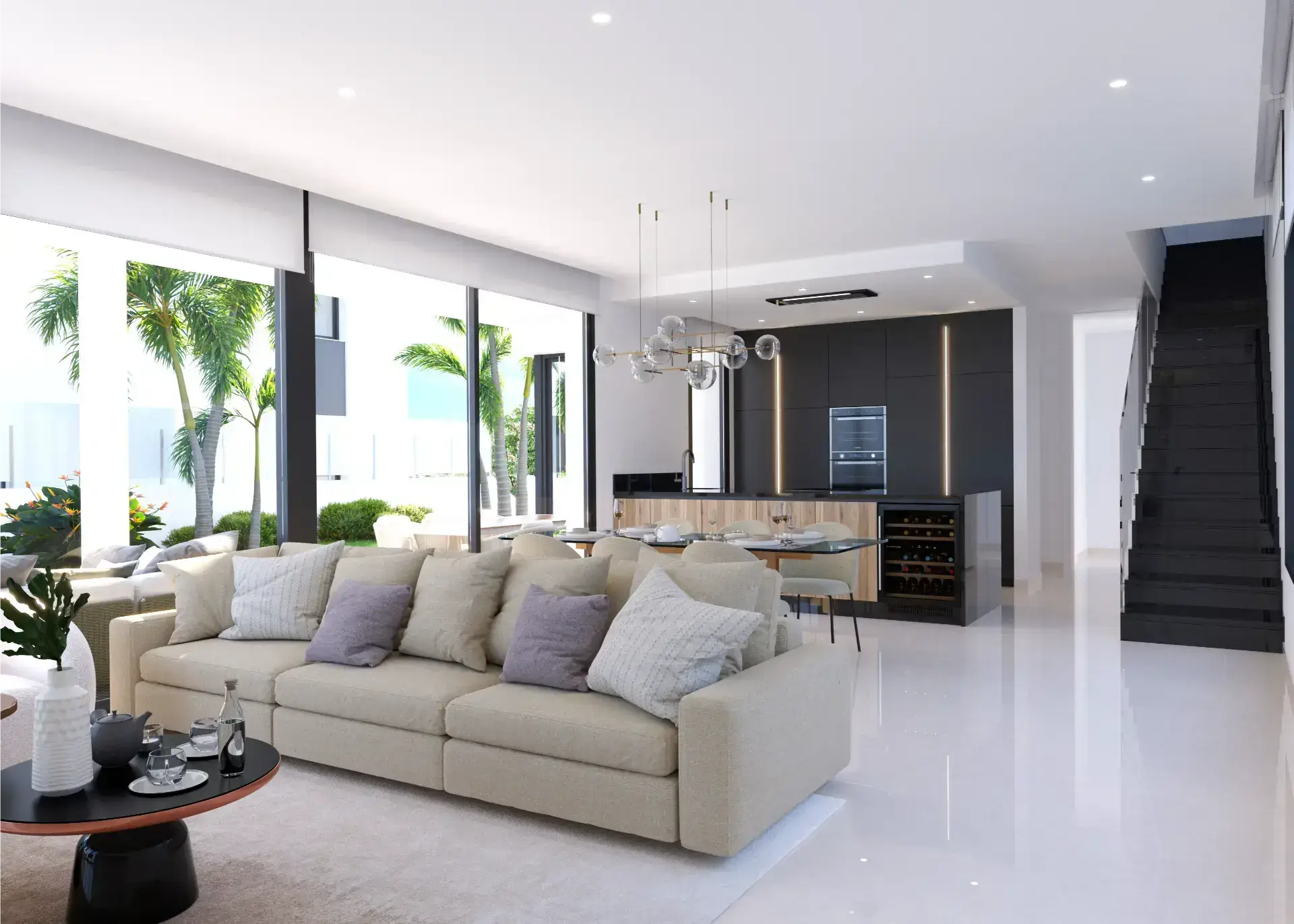 - nowoczesna kuchnia – każda willa jest wyposażona w sprzęt Siemens najwyższej klasy: lodówkę, piekarnik, mikrofalówkę, płytę indukcyjną, sufitowy okap